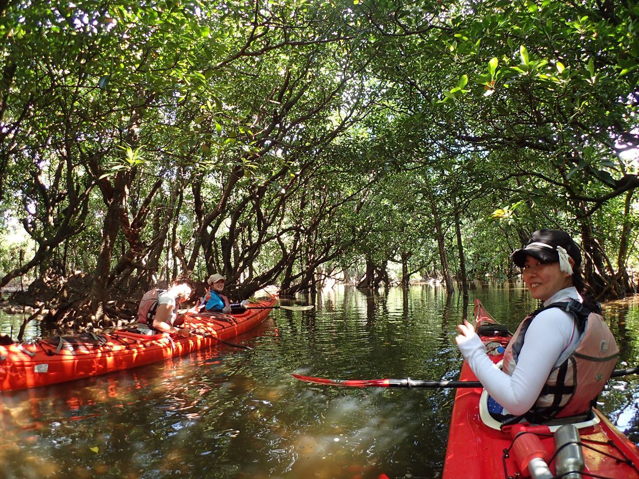 マングローブの中を漕いで行く雰囲気を感じたいならこの二つの河川が間違いありません。細い水路の中に入ると、マングローブの木洩れ日がたまりません。サガリバナの季節は朝の川面にある花と香りは南国そのもの。前良川上流はプチトレッキングも楽しめ滝つぼで泳ぐこともできるので子供たちに人気があります。