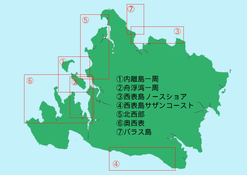 西表島最北端のウナリ崎から西へ。伝統の残る集落、干立、祖納の沖をまわります。