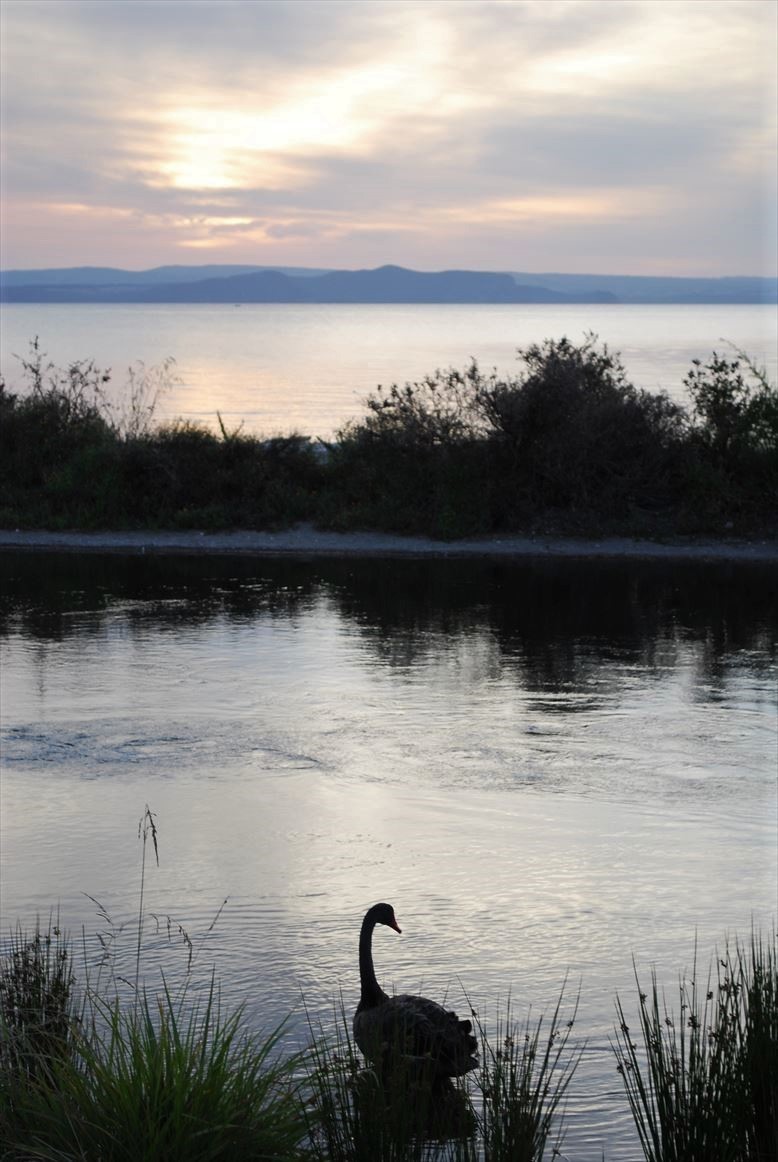 湖岸に荷物を下ろし、カヤックを組み立てていると空と湖面が恐ろしいまでに赤く染まりはじめた。これほど深紅の色を魅せた夕日は初めてだ。そこをブラックスワンが泳ぎ、なんとも幻想的な雰囲気が漂っている。