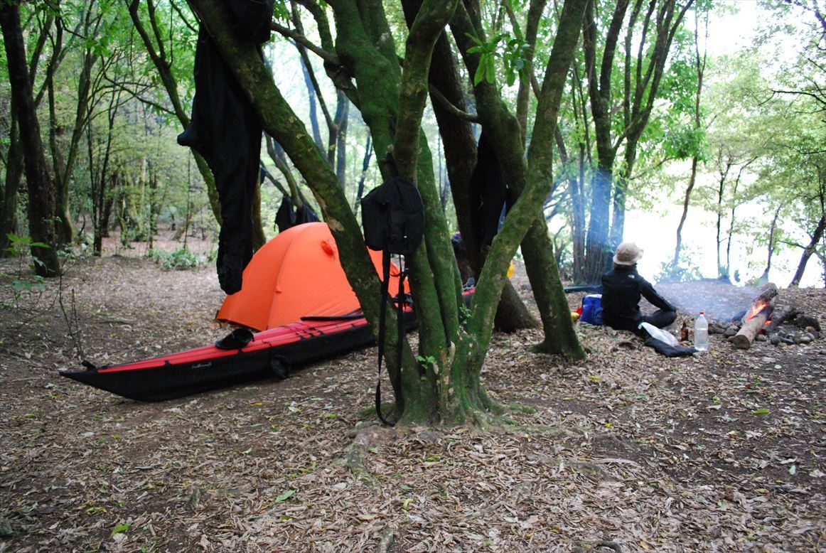 この場所は湖岸からしか来ることができない場所で、森の中にはステンレスのデッキが置いてあり、針金がめぐらしてあってフィッシュキャンパーがよく来ている場所のようだった。湿っていたが落ちている薪を拾い集め、今日のキャンプの準備を始める。