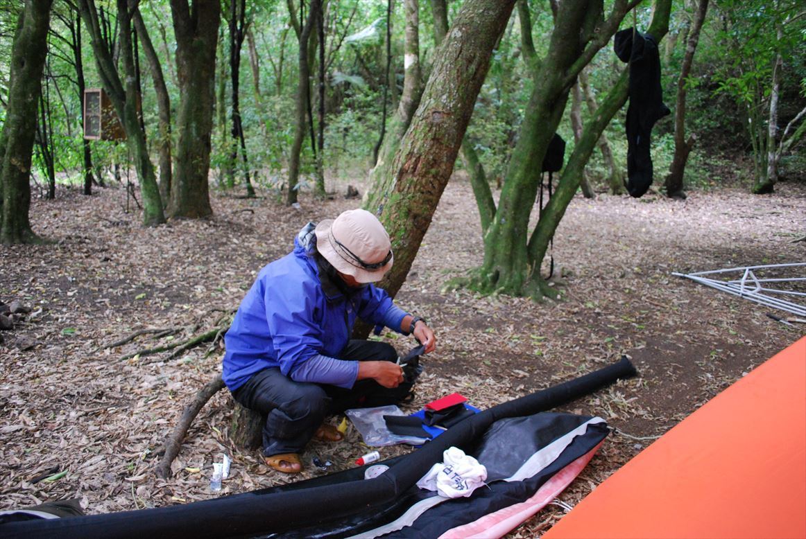ただ、ここにきて少し気になることがあった。左側のスポンソンの空気が抜けているのだ。これといって原因が思い当たらなかったが雨が降らないうちに修理しようと一度カヤックのフレームを抜き、面倒くさいがスキンをひっくり返しスポンソンを引っこ抜く。そしてふくらませて自転車のパンク修理のように湖の中に突っ込んで泡が出る場所を確認すると、かなり先端の場所に穴が開いていた。