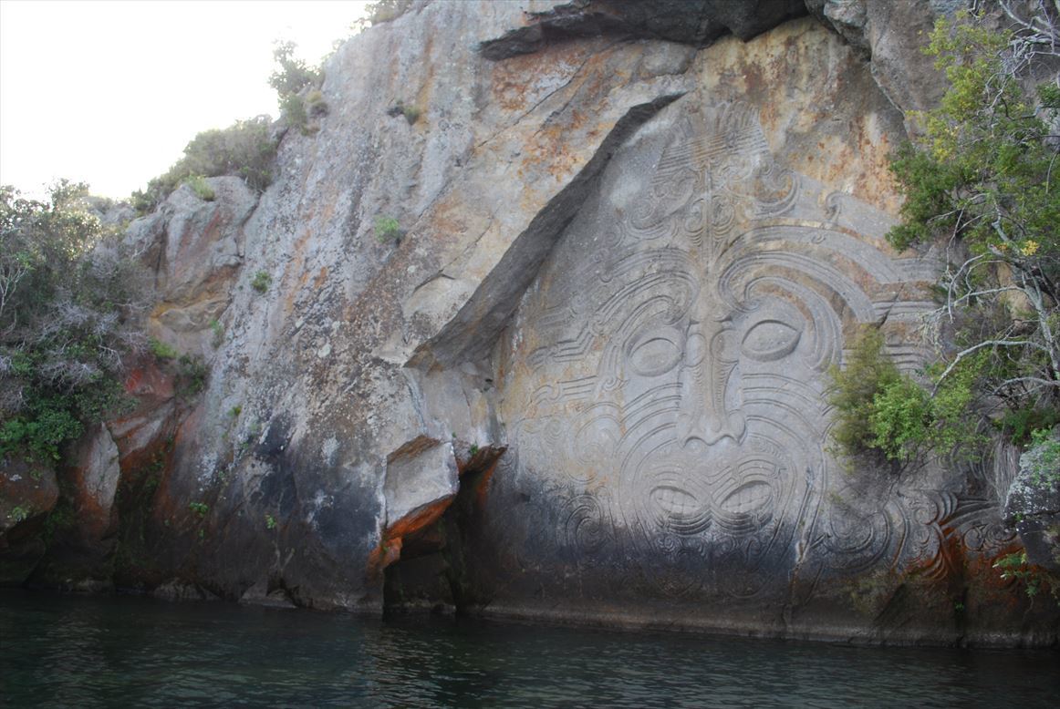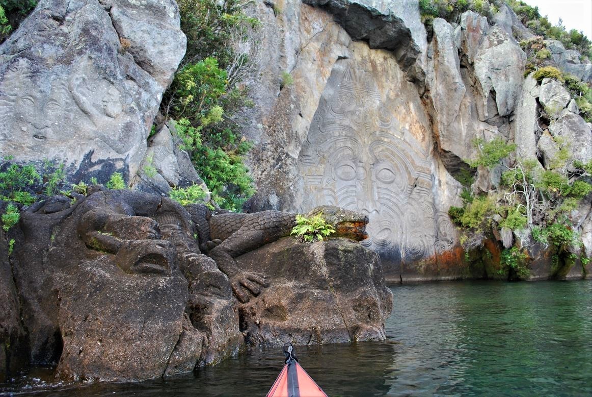 日本を発つ寸前に行った第3回知床シンポジウム。ここで出会ったOさんが以前にニュージーランドの川を漕いだ時、この湖も漕いだと言っていたのを思い出した。ここには天然の岩判に描かれたマオリ彫刻があり、そこがタウポツーリングでの目玉になっているようだった。彼はこの存在を何の情報もなく漕いでいたら発見し、大感動したというのだ。
