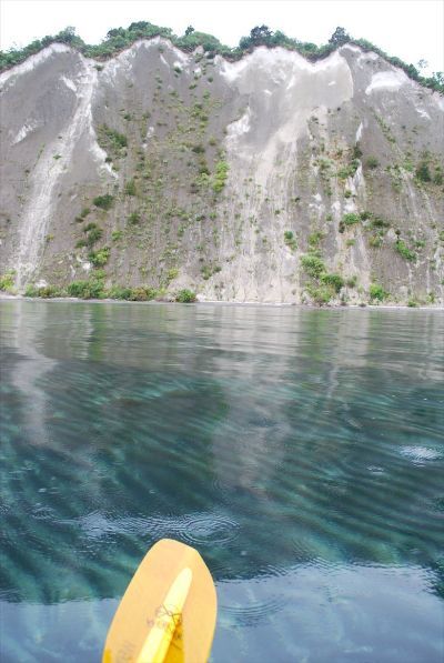 それにしてもこのあたりの崖はすごい。深く切りたった壁が垂直に湖底へと続いているようだ。地図を見ると岸から数メートル沖に出たところで一気に水深80mという表示が出ている…!日本でも富士山の噴火でできた湖、精進湖は水深200mちかい深さを誇っているが、この湖も然りのようだ。