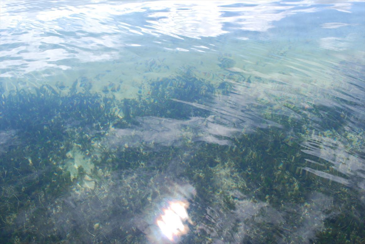 その砂地はなだらかに落ち込んでいくかと思うと、入江の入り口で急激に落ち込み、底がまったく見えなくなる。岸には巨大な岩がそびえ、その岩の間にはチャガラのように小さいハゼが固まって泳いでいる。透明度が良いのでこんな太陽の光が差さない状況でもきれいなブルーの湖底が広がる。はっきり言って深すぎる。良くいえばグランブルー。悪く言えば底無しの恐怖の対象。