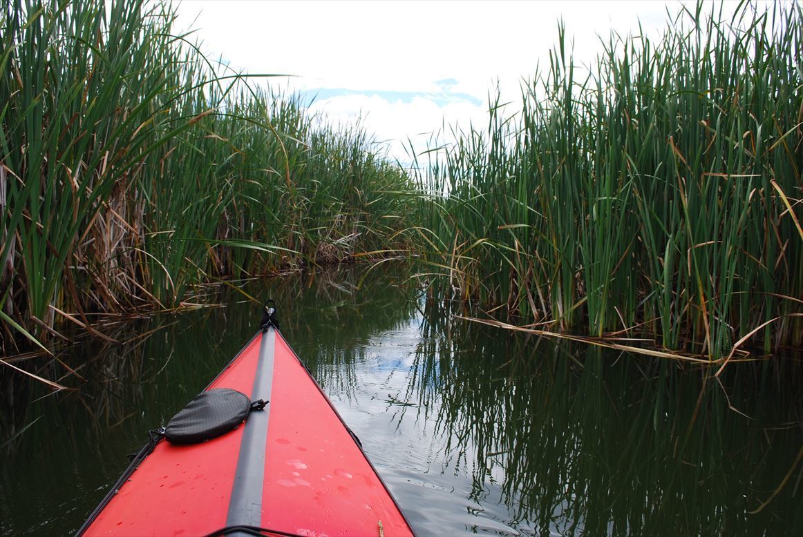 ガマの茂みをかき分けながら進むと、水鳥の聖地のような静かな場所が広がった。こういうヨシやガマなどが生えている場所を移動する手段としてもカヤックはいい道具で、そこから見る景色はなかなかいい。少しの間そんな目線の低い水辺の観察をすると再び外に出て、砂浜で休憩した。天気は見事に回復し、濡れたカヤックやウェアーからは湯気が出始めた。