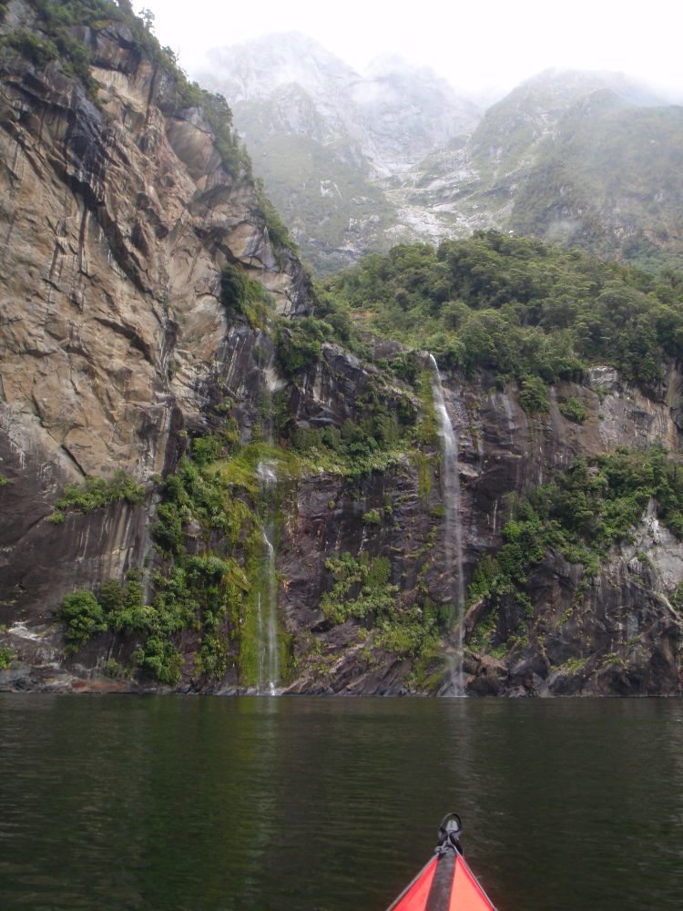 マイターピークの真下までは絶壁が左手側に延々と続く。その真下から山頂を見上げると、頂上付近は木や草が生えておらず、灰色の岩壁が剥き出しになり、そこに雲がかかって、何とも幽玄だ。所々に小さい滝があり、海水に流入している。 対岸を見ると観光船が滝壺近くまで船首を突っこむっことで有名なポイント、スターリン・フォールが見えた。巨大なⅤ字型に切れ込んだ谷から155mもの落差を誇る大瀑布だ。その轟音が耳に届く。